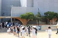 運動場から4階の屋上に全員がそろうまでに5分8秒かかりました。