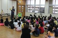 4校時は絵本作家のあきやまただし氏による読み聞かせライブを行い、1年生が参加して楽しみました。