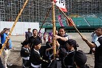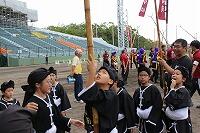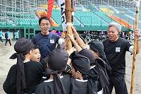 4年生、5年生が大人の手を借りずにしっかりと旗頭を持ち上げます。