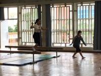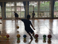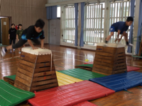 体育委員会の企画で、昼休みの体育館に5つの障害物をセットして時間内にクリアできるかを試す競技が行われています。