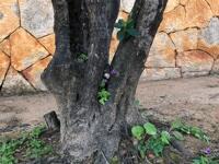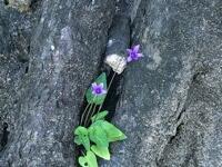 運動場の隅の木の中から、スミレの花が顔をのぞかせていました。