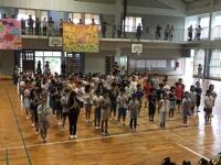全児童が見守る中、1年生が6年生と手をつないで入場しました。