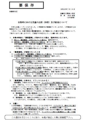 7月18日付けで配布したお便り「台風時における児童の出校(給校)及び給食について」をホームページにも掲載いたします。