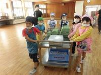 2年生が給食を専用のカートに乗せて教室に向かっていました。入学したてのころに比べると給食の一通りの流れや作業が身に付きましが、食器はまだまだ重く感じます。こぼさないように、おとさないように、やけどしないように教師の声掛けや力をかりて自分たちで運搬や配膳、片付けを行っています。(^^)