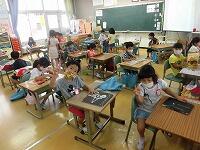 本日の気温は28度、湿度82㌫、熱中症注意計の針は「注意」を指していました。今日も少し動くだけで汗ばむ暑い日となりましたが、子どもたちは元気よく学校生活を送っていました。(^^)