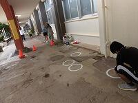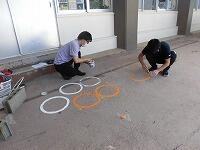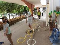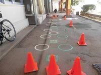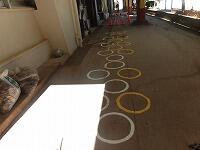 あいさつ通りにケンケンパーの輪を描きました。難易度の異なる3つのコースがあります。リズム感覚、バランス感覚が高まればと思います。(^^)