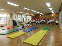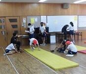 【授業の様子】(5年側転、ロンダート、2年ケンケンパー 1年話し合い活動 4年止めてパス 4年保健指導)