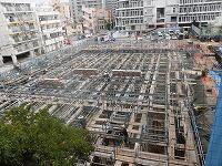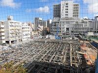 【朝の様子 体育館建築の様子】 3m位掘り下げられた地盤から組み立て始めた足場は、3段目の組み立てに入り、地面より高くなって来ています。
