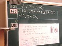 【3年生算数の研究授業】 校内研の一環で、今日は3年生担任が「棒グラフ」の授業を行いました。授業のポイントは、表に書かれているデートを見て、グラフに表すとき,ひとめもりの大きさをどれくらいにするか、考えて、実際にグラフにすることです。教師が一方的に教えてるのではなく、授業を通して、こどもの思考、判断、表現の力をたかめる手立てが授業後の反省会での論点となります。子どもたちは、他の教師が見ている中でも、臆することなく発言したり、課題に取り組んでいました。(^^)
