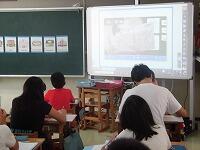 【6年英語の授業】 担任がリードしながら、表現の仕方や発言はAETの先生が担い、具体的なイメージは電子黒板に表示させて「英語」の授業が行われていました。(^^)