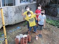 【朝の様子】 栽培委員が空いた花鉢の土をこぼし、種類毎にまとめていました。3年生がぐーんと生長してきたひまわりの観察をしながら雑草抜きをしていました。(^^)