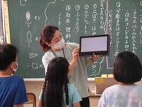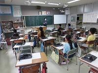 午前中はほどよく陽がさして、よい天気となりました。出校日、三つの時間帯に分かれて子どもたちが登校してきました。児童玄関前で検温などの健康チェックを受け、久しぶりに教室に入りました。自分の机の上にはすでに、タブレットと電源、書類が置かれており、短時間で今後の予定や留意点、タブレット操作についての話を聞きました。(^^)