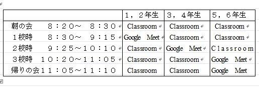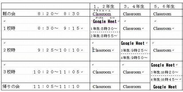 オンライン授業は明日も同じ日課で行われますが、Google Meetのみの活用時間帯を下記のように変更します。(ネット回線をもっと速くするためです。)