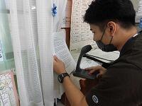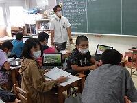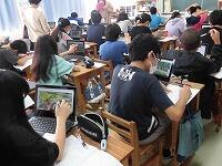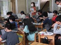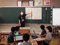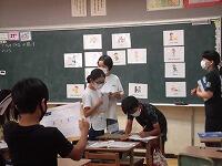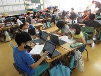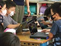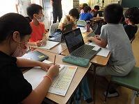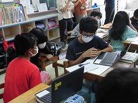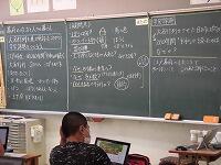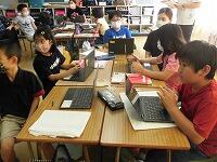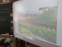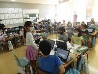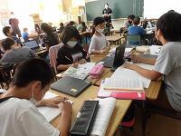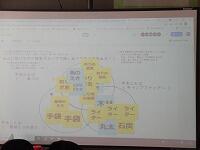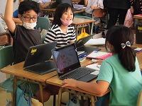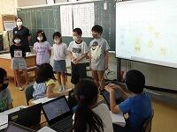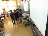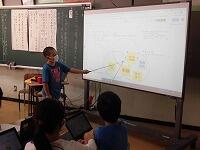 3年生が国語の学習において、タブレット端末のジャムボード機能(模造紙に貼り付けた付箋紙を誰もが自由に動かすイメージのソフト)を活用して、お互いの考えを集約して、大型モニターに映し出して発表していました。(^^)