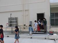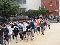 【地震津波避難訓練】 2校時に地震が起こり、その後津波が来ると言う想定で避難訓練を行いました。一時避難場所で地震のおさまりを待っていると今度は津波が押し寄せてくると言うこと(想定)で校舎の屋上へ移動しました。