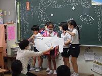 校内研修の一環で1年生が国語の単元「くじらぐも」の学習を行いました。場面の様子に着目して、登場人物の気持ちや行動を具体的に想像して内容の大体を捉える。というのが目標です。子どもたちは、本文を読んだり、挿絵を見たり、動作化したりして、鯨に乗っているときの言葉や気持ちをワークシートの吹き出しに書きました。その後、友達同士そして学級全体で考えを共有しました。(^^)