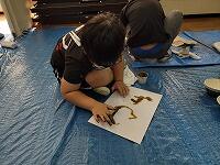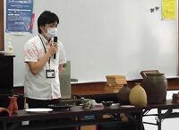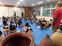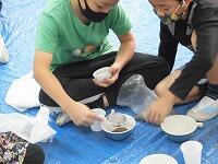 【3年生 土で描こう】子どもたちは、壺屋焼物博物館より数名の講師をお招きして、壺屋焼の土で沖縄「南部の土」と「北部の土」の質のちがいやうわぐすりとの相性、そして焼くときの温度の違いについて学んだ後、実施に校庭に出て土を採取し、すりつぶし、こし器にかけ、「土で描こう」の材料を作りました。(^^)