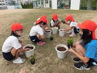 一人一鉢運動ということで学年で統一した花を植えて育てます。水やりや雑草取りを行い大切に育て、卒業式や入学式では会場の装飾として活かされます。(^^)