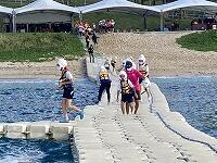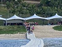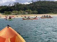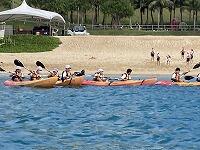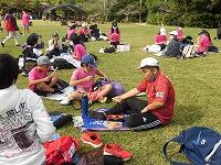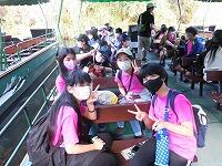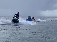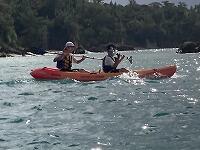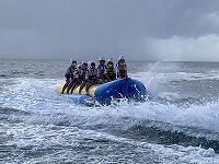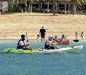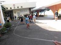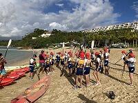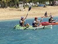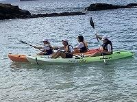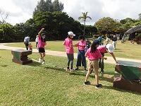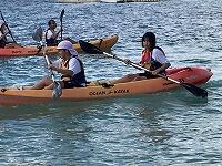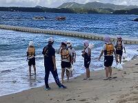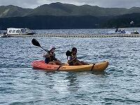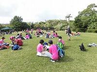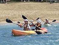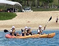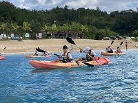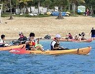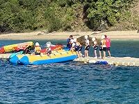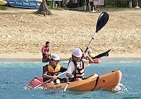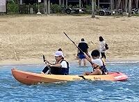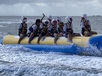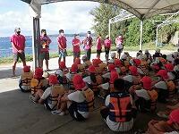 二日目、子どもたちは、宿泊先でおいしいご飯でおなかを満たしてネルギーを蓄え、名護市三原のカヌチャビーチでマリン体験に臨みました。スタッフのこまかな説明と配慮そしてライフジャケットで安全を確保し、バナナボート、カヤック、遊泳を体験しました。心配されていた午後からの天気の崩れに支障をきたすことなく、旅行の行程をこなすことができました。宿泊所での出し物大会では、子どもたちが普段見せないパフォーマンスを見せ、大変盛り上がりました。やはり、子どもたちにとっては宿泊所でのことが一番楽しかったようです。(^^)