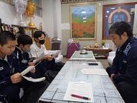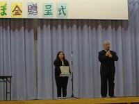 那覇市の福祉協議会の担当、真栄城さん、玉城さんにお越し頂き、朝会にて贈呈式を