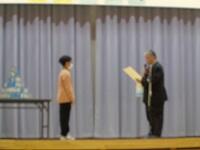 募金贈呈式の後に、昨日から職場体験で来校している上山中の3名の生徒さんに一言挨拶をしてもらいました。