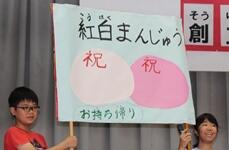 児童会「まだまだあるよ。なんとおうちの人とも家でお祝いしてほしいから、持ち帰りの紅白まんじゅうがあるんだって。」