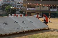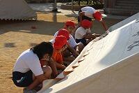鉄骨を組み立ててシートを結びつけるまでの作業を6年生がグループごとに担当しました。