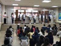 6年生の各委員会の代表が、5年生の学年朝会で委員会活動の紹介をしました。
