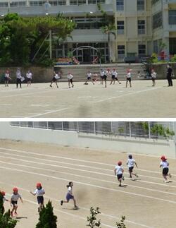 晴れ渡る青空の下,4年生が新体力テストの『ボール投げ』と『50m走』を行っていました。まだ少し涼しい風が吹く中での測定でした。