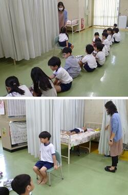 1年生は『心電図検査』を行いました。入学式から1週間。自分の番が来るまで静かに待っています。