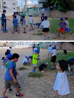早登校してきた花っ子たち。教頭先生が一緒に運動場の雑草抜きをお願いすると,喜んで活動していました。すてきな花っ子たちです。