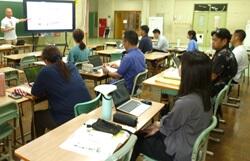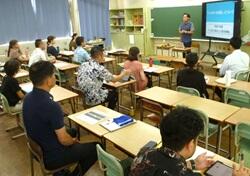今日の午前中は,『いじめに特化した校内研修』を行いました。那覇市教育委員会の我如古忍指導主事に御講話いただきました。いじめに関して,また新たな考えや対応方法等を学びました。