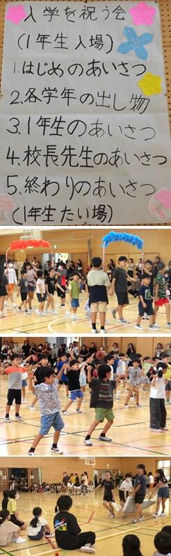入学から1か月。1年生を歓迎する『入学を祝う会』を行いました。2~6年生が,呼びかけやダンス等を披露しました。授業参観も兼ねての祝う会,保護者も子ども達の活躍を参観できました。