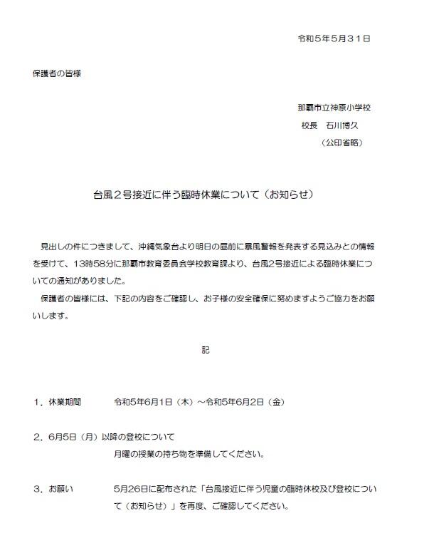 台風2号接近に伴う臨時休校について(おしらせ)