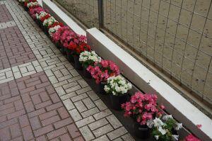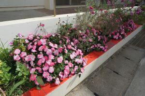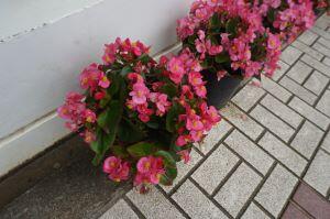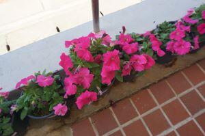 ベランダには、赤いペチュニアがきれいな花を咲かせています・・