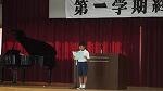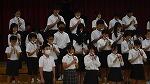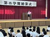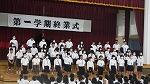教頭先生による始めの挨拶の後、全校児童で校歌を合唱しました。そして1学期を振り返って、2年生と5年生の代表児童による発表がありました。2年生は1学期、生活科で野菜をたくさん収穫したことや、算数の計算がうまくできるように頑張ったこと等を取り上げ、2年生児童全員で「1がっきありがとう」というかけ声で発表を終えていました。5年生は代表児童が、朝の清掃活動を5年生になって始められたこと、8時前に集会をもち全員で取り組んでいること、2学期の運動会で5・6年合同で行うエイサーの演技を朝も放課後も覚えるために頑張ったことを発表していました。