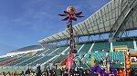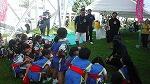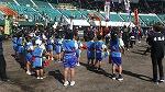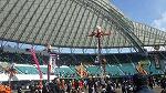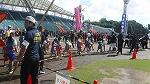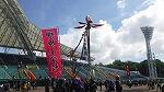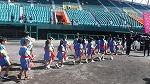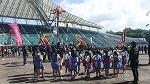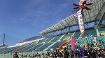 本日午前10時より沖縄セルラースタジアム那覇において、本校を含む那覇市内の各小中学校の児童・生徒の皆さんが参加して、「第18回 やる気・元気 旗頭フェスタ in なは」が行われました。本校児童の皆さんは、本庁ブロックと本庁・小禄ブロックの2回で元気な演舞を行いました。チンク隊の鐘の音や、合図のホラ貝の太い響き、ベルの音、パーランクーの音、そして勇壮なかけ声に合わせて旗頭が空高く舞いました。ベルの音に合わせたチンク隊の一糸乱れない動きに会場スタッフの方も感心していました。