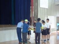 神原小交通少年団を結成しました。那覇警察署、交通安全協会、市民生活安全課から交通安全ベスト、帽子の贈呈がありました。今後は朝の挨拶運動の際にベスト、帽子を着用し、交通安全の意識を高めます。