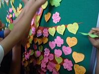 9月はいじめ防止月間。取組の一つとして、みんなが気持ちよく学校生活を送れるように、友だちに言われたらうれしくなるようなプラスの言葉を一人一人が付箋紙に記入し、神原ポッカポカの木に貼り付けます。