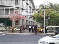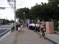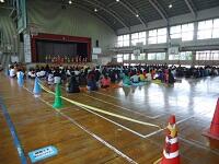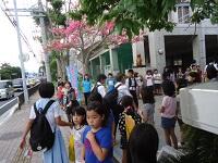 小学生は中学校へ、中学生は小学校前で行っています。今回は幼稚園生も参加しています。