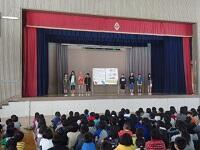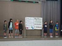 児童朝会では、給食委員会の児童が、残量調査の結果を報告したり、食べ物にちなんだクイズを出題したりしました。
