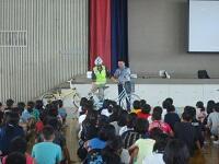 自転車の点検方法やヘルメット装着の励行、右左折や停止の手信号などについて話していただきました。また、実際に子どもたちが自転車に乗る体験もしました。