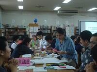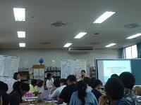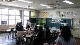 小学校での英語の授業スタイルが踏襲され、小中の接続時期としてスムーズに進められていました。授業後は、神原中ブロックの共通実践事項である、「授業における基本事項」に基づいて、小中の先生方が入り交じり活発な議論が交わされました。