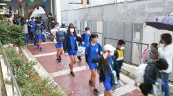 本日朝8時より、修学旅行出発式を行いました。明日は晴れますが、今日はあいにくの雨もようです。団長の校長先生が、「楽しみな人?」と聞くと、どの児童も手をあげていました。児童は「楽しみにしていた、けんかしないでみんなで思いっきり楽しみたい」と語っていました。本校は今年、体育館もないため、正面玄関前の青タイル前で行いました。全員あいさつ、誓いの言葉等も元気よく言えるその姿は、さすがは、小学校生活最後の最高学年である6年生です。規律を守り、学びも得ながら、元気に思い出に残る修学旅行になるといいですね。さあ、いってらっしゃい6年生!