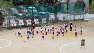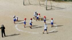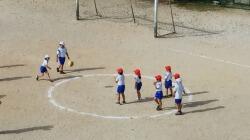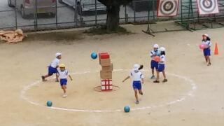 日頃の授業の様子です。1年1組、1年2組の体育の授業(ボールを的に当てる、投げ方)では、今回は授業改善リーダーの先生のもと授業を行っていました。いかにボールを的に当てるのか、投げ方の工夫や、遊び楽しみながら授業していました。狭い運動場を有効に使っています。