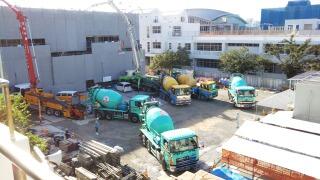 神原小学校体育館建て替え中です。工事の方も暑い中ありがとうございます。着々と進んでいるようです。最近はコンクリート車が頻繁に入ってきております。外壁のカバーが外されるのが楽しみです。「無事故の歳末、明るい正月」になるよう、完成までよろしくお願いします。