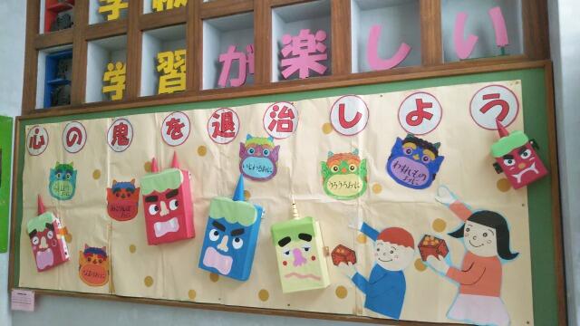 節分を2月2日に迎え、1年、3年、4年生の各学級では「心のおにをやっつけろ!」と題し、