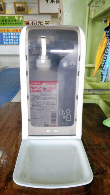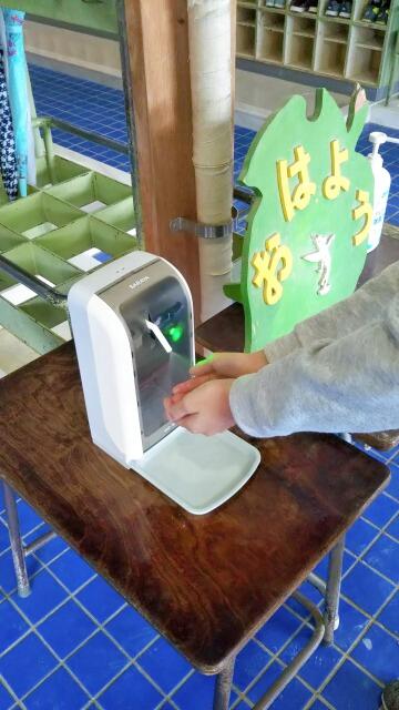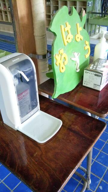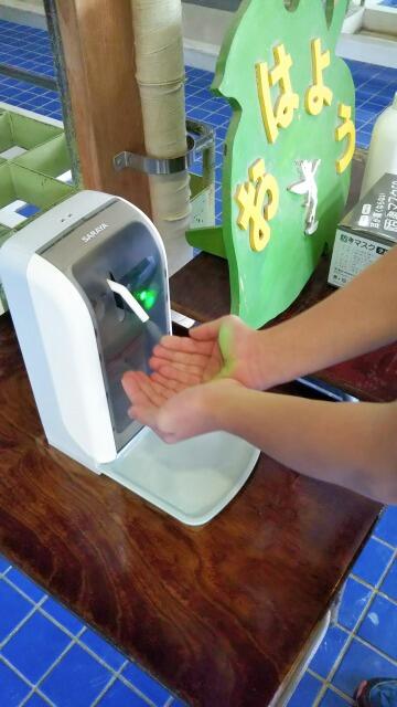 そんな中ですが、これまで以上に感染予防の徹底に努めるべく、本日より児童玄関に自動センサー消毒器の設置しました。