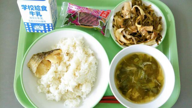 今日の神原献立:むぎごはん、とうふのみそ汁、クーブイリチー、魚(たら)のてりやき、元祖紅いもタルトでした。