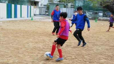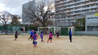 限られた運動場ですので、広いコートは作れずミニコートを作り、試合は6対6、前後半10分、休憩2分、アディショナルタイムありで対決しました。